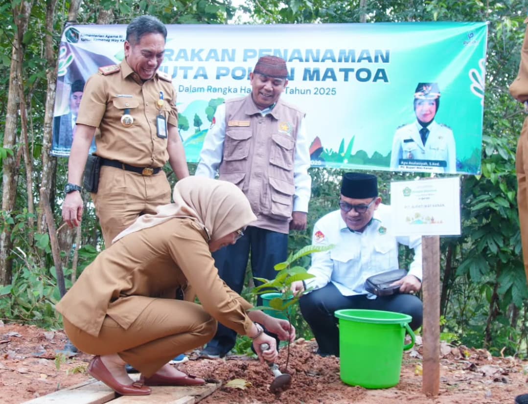 Way Kanan | Reportasepagi.com – Pelaksana Tugas (Plt.) Bupati Way Kanan, Ayu Asalasiyah, S.Ked menghadiri Acara Penanaman Sejuta Pohon Matoa Serentak Dalam Rangka Peringatan Hari Bumi Sedunia Tahun 2025 di Kantor Kemenag Kabupaten Way Kanan, KM. 03 Kecamatan Blambangan Umpu, Selasa (22/04/2025).
