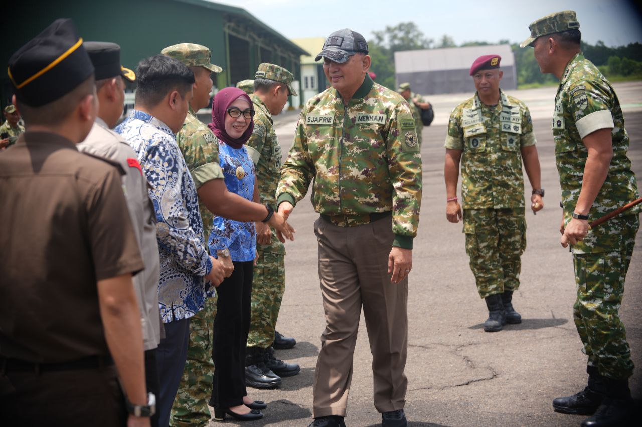 Way Kanan – Bupati Way Kanan Ayu Asalasiyah, S.Ked., menghadiri Upacara Penyambutan Kunjungan Kerja Menteri Pertahanan Republik Indonesia, Jenderal TNI (Hor). (Purn.) Sjafrie Sjamsoeddin dan Wakil Panglima TNI, Jenderal TNI Tanyo Budi Ravita beserta rombongan di Lanudad Gatot Soebroto, Kecamatan Way Tuba, Kamis (26/02/2026).